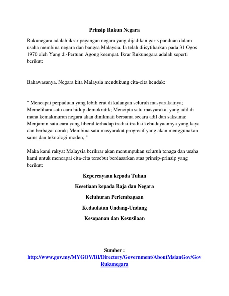 Mungkin juga ramai sudah lupa bahawa tujuan utama lima prinsip Rukun Negara itu adalah untuk membentuk perpaduan yang kukuh serta kunci kepada keharmonian dan perpaduan masyarakat. RUKUN NEGARA Inggeris menggunakan. Selain itu Kebebasan asasi juga terjamin bagi semua warganegara Malaysia.